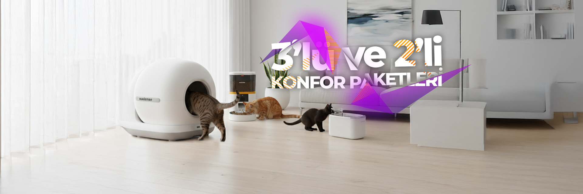 Haustier HST-CB001-Gri Akıllı Otomatik Kedi Tuvaleti HST-QQ005 Beyaz Akıllı Mama Kabı 2 li Set Haustier Türkiye Garantili