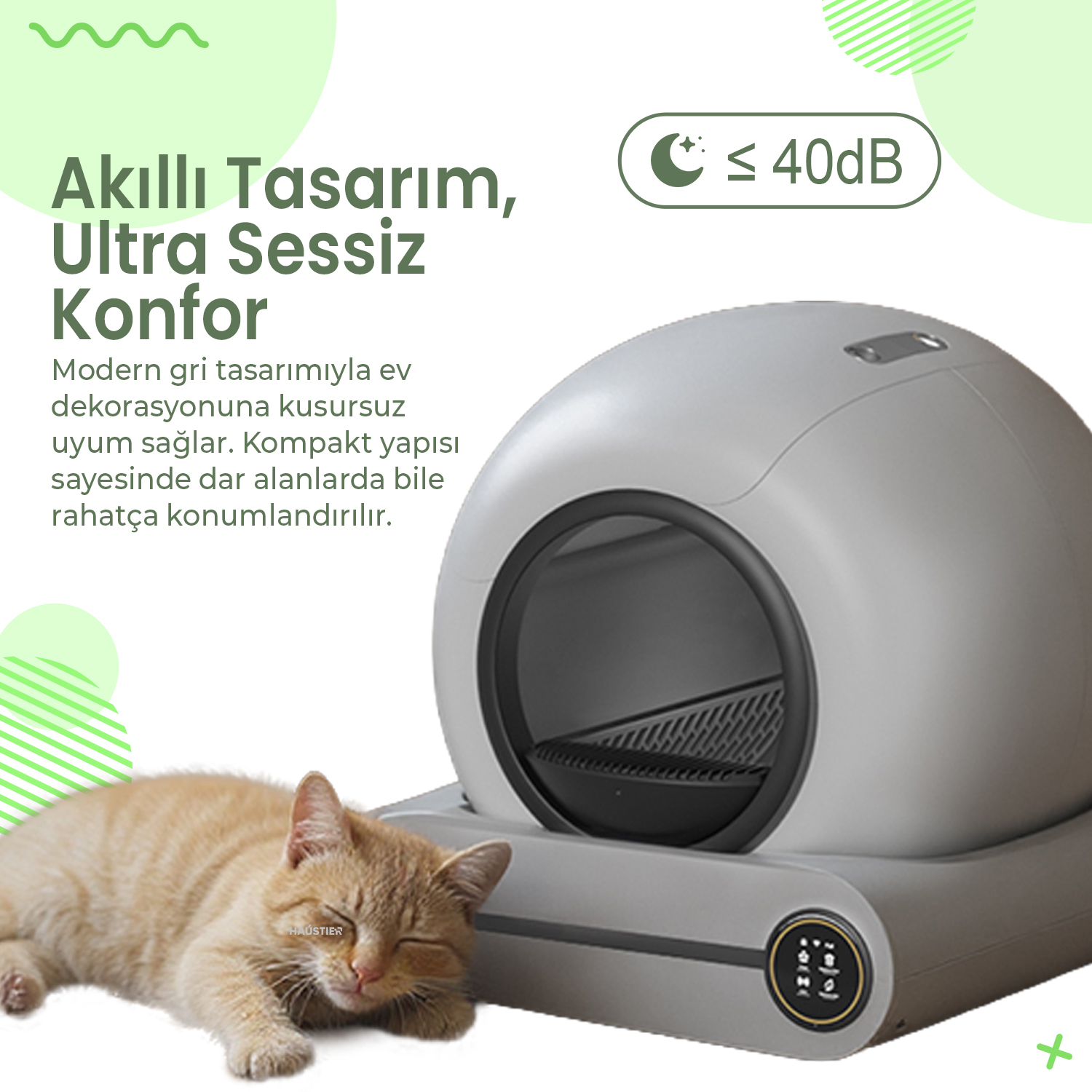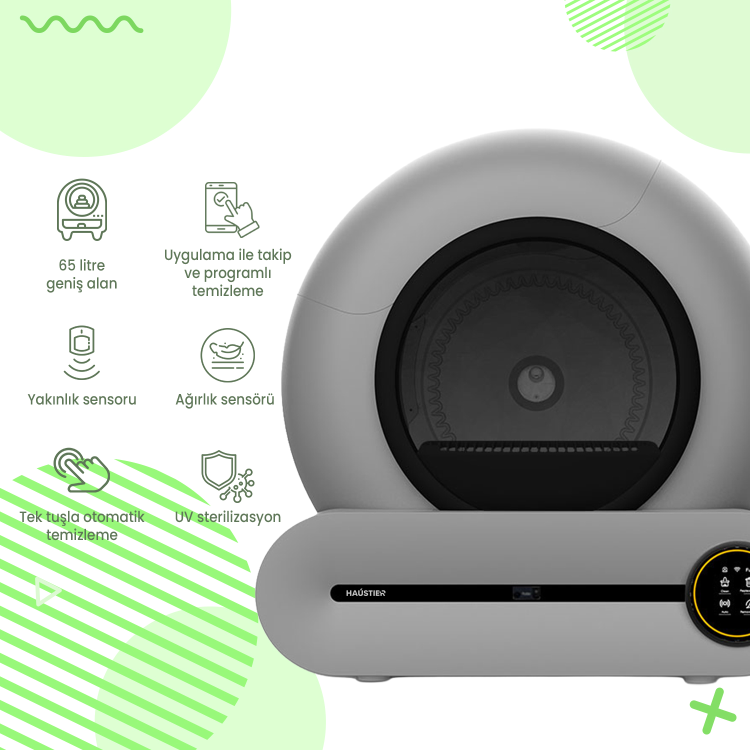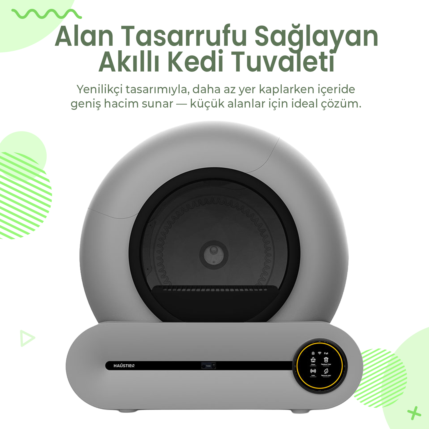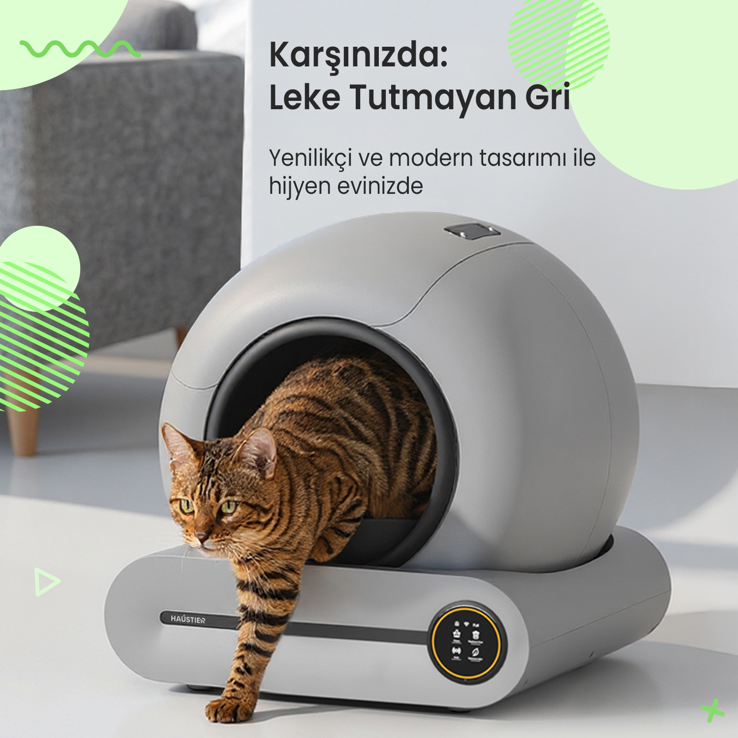 Haustier BF01 Akıllı Otomatik Kedi Tuvaleti, Uzaktan Kontrol, 65lt Hazne, 9lt Çöp haznesi-UV Kötü Koku Temizleme, Ağırlık sensörlü Gri