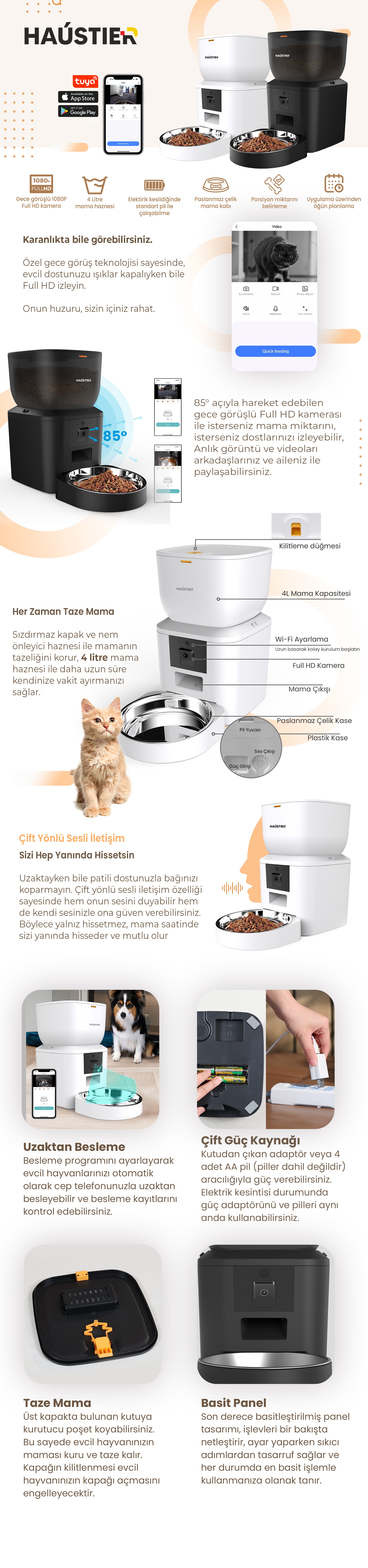 Haustier QQ025-Dual Beyaz Kameralı Akıllı Kedi Köpek Otomatik Mama Kabı, App Uzaktan Kontrol, Sesle Çağırma, 480P Kamera, 4lt Hazne, Çift Metal Kase