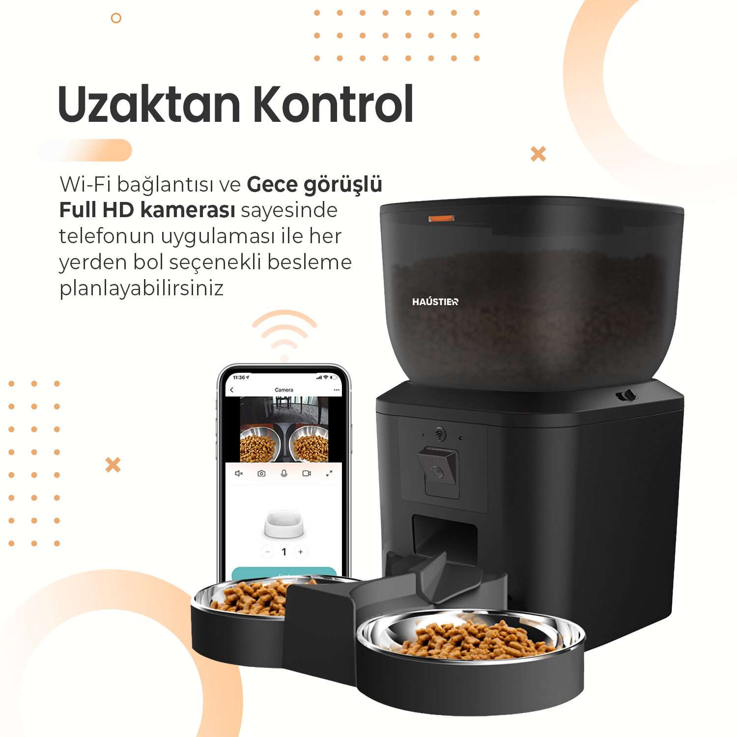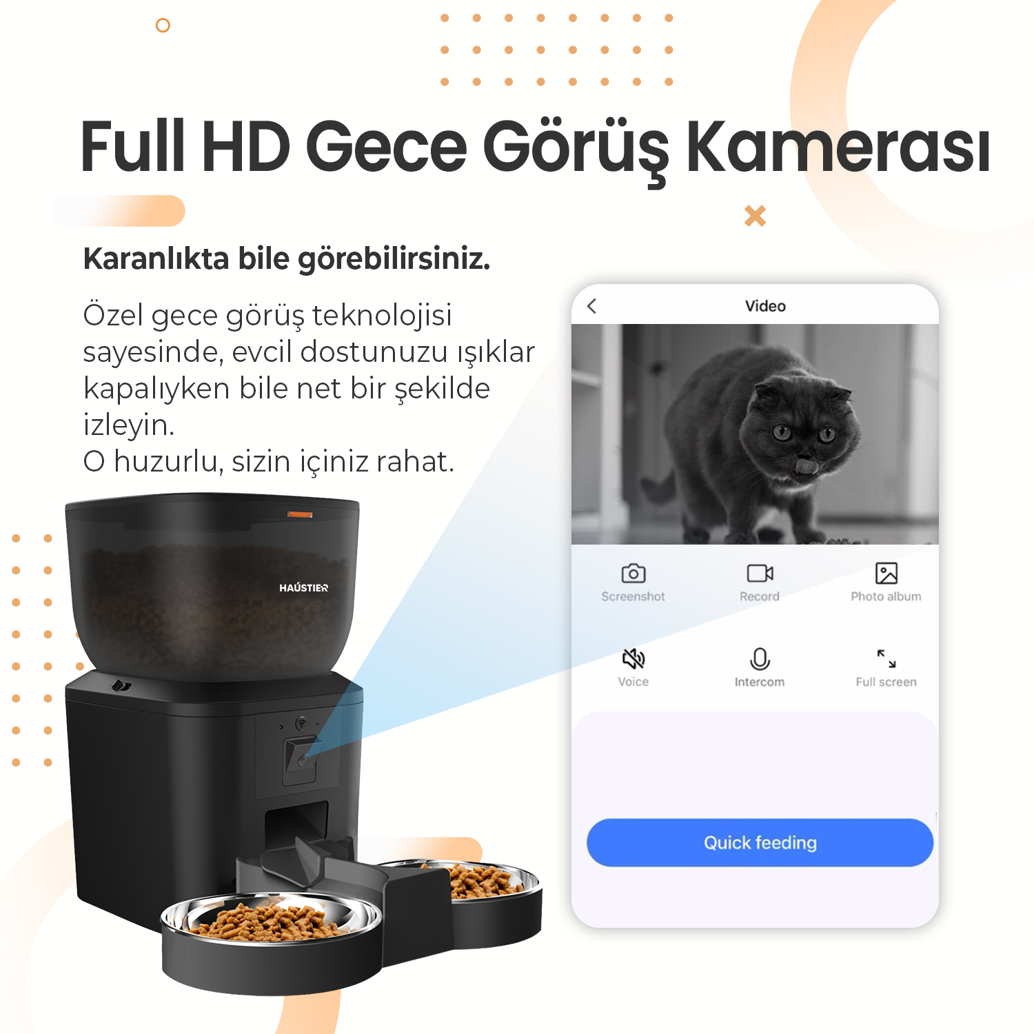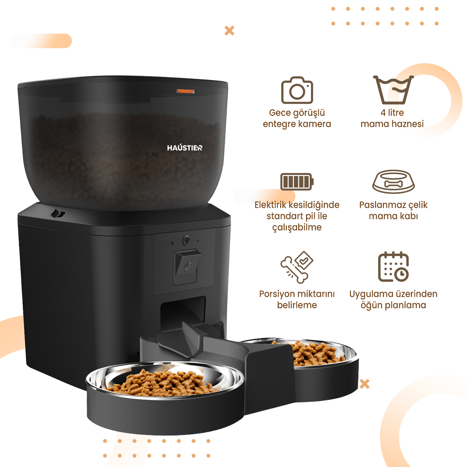Haustier QQ029-Dual Siyah 1080P Gece Görüş Kameralı Akıllı Kedi Mama Kabı, Tuya App-Wifi Uzaktan Kontrol, Sesle Çağırma, 2.4Ghz5Ghz, 4Lt hazne, Çift Metal Kase