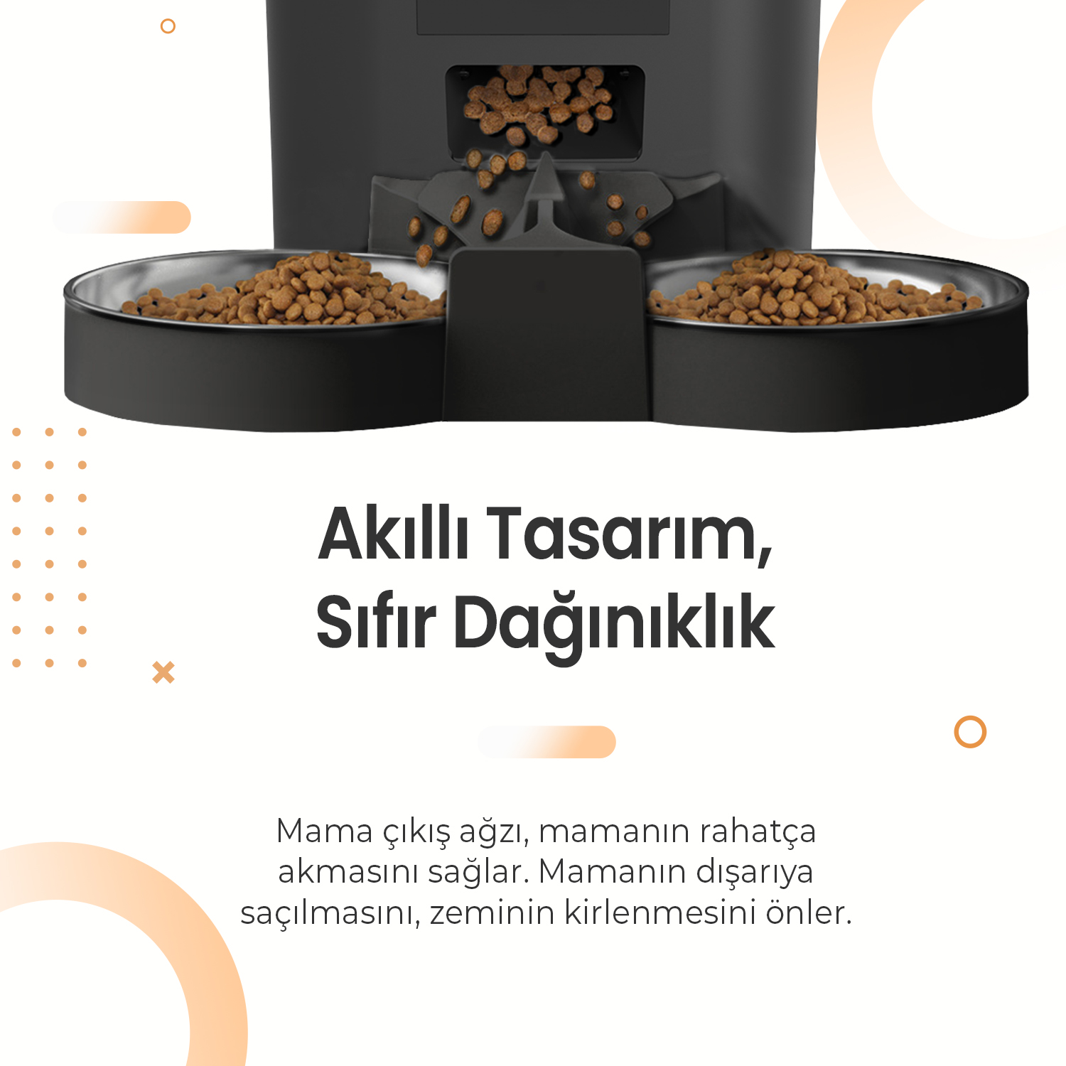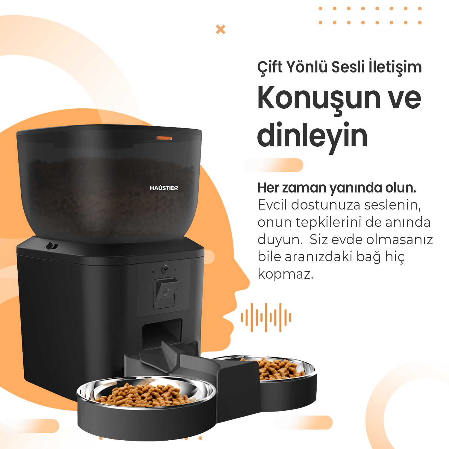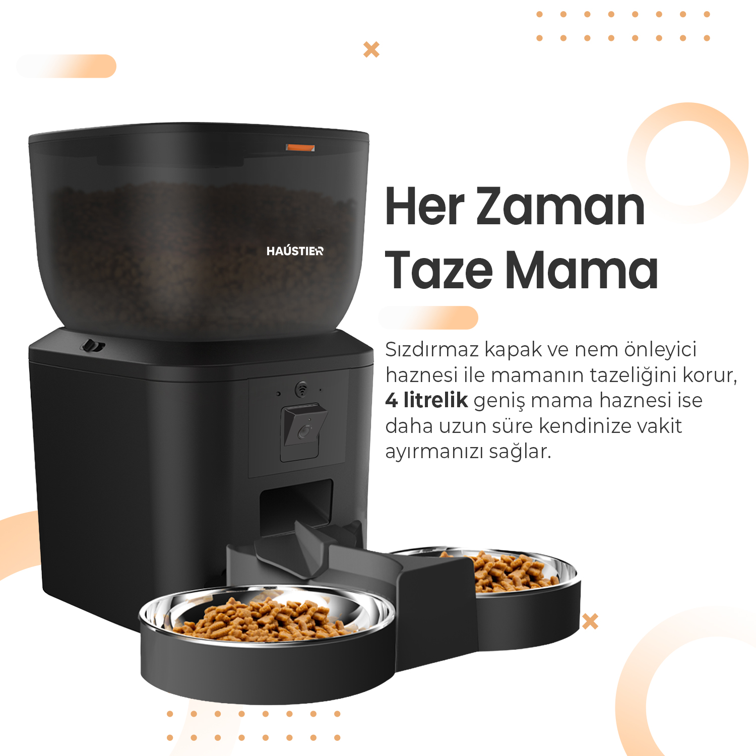 Haustier QQ029-Dual Siyah 1080P Gece Görüş Kameralı Akıllı Kedi Mama Kabı, Tuya App-Wifi Uzaktan Kontrol, Sesle Çağırma, 2.4Ghz5Ghz, 4Lt hazne, Çift Metal Kase