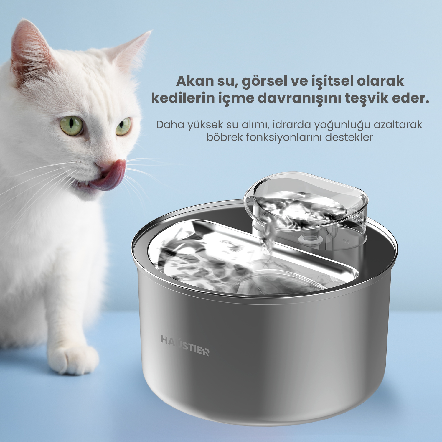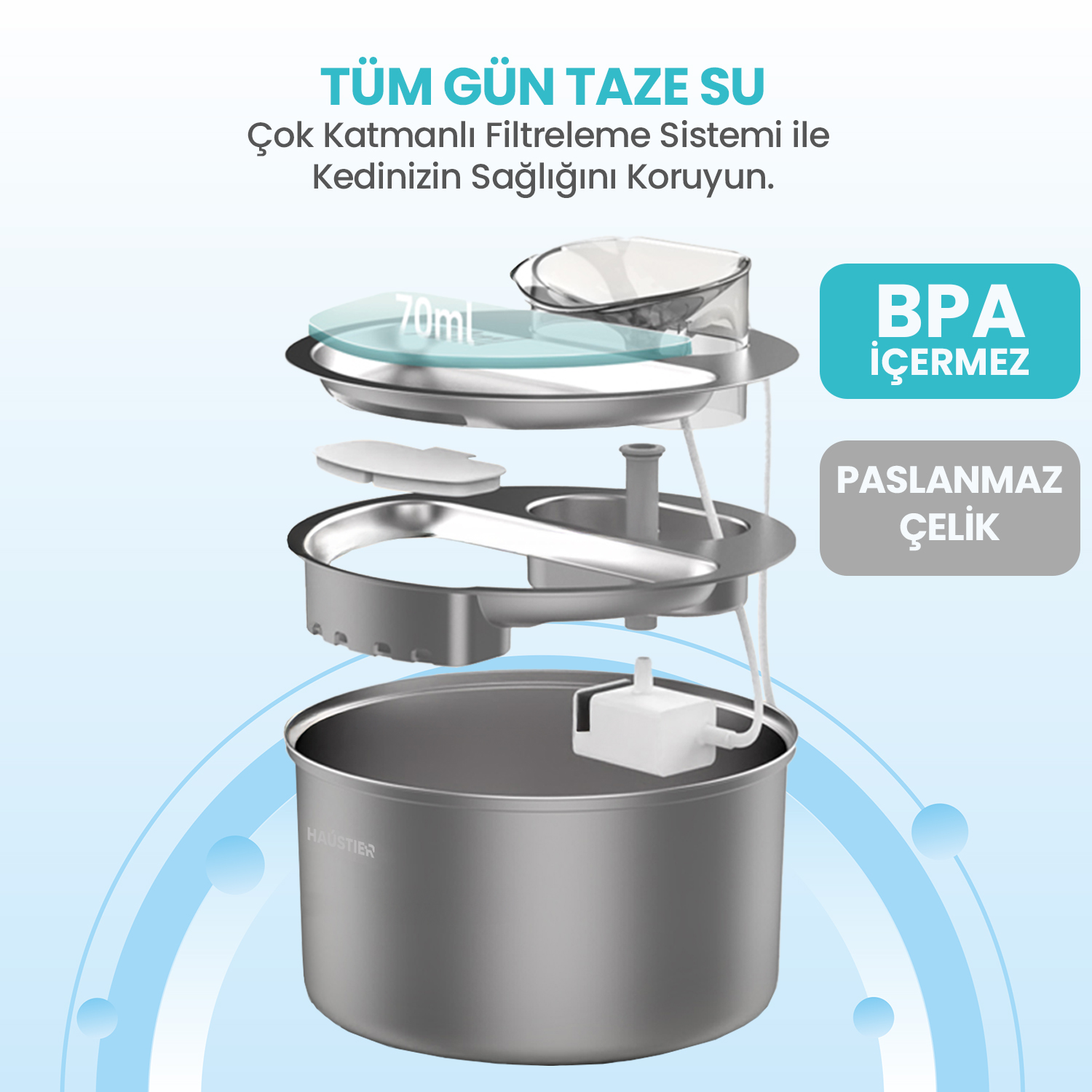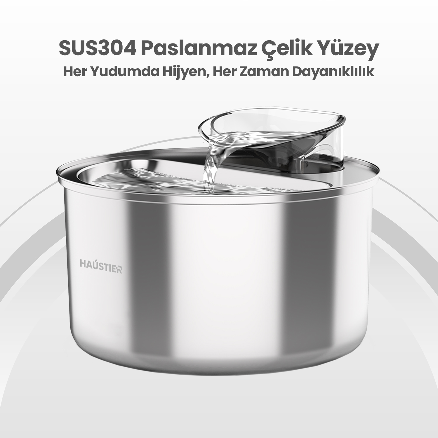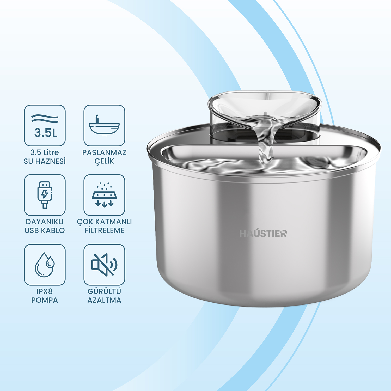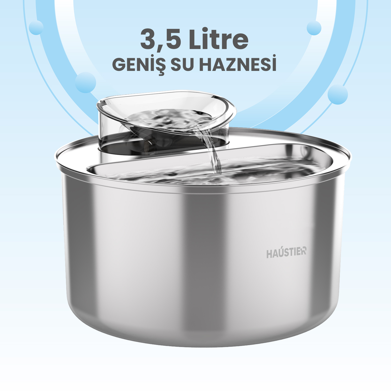 Haustier WF009L Metal Tasarım Otomatik Kedi Su Sebili, Kedi Su Çeşmesi, Su Pınarı 3.5Lt Geniş Hazne, SUS304 Çelik, Ultra Sessiz, Çok Katmanlı Filtrasyon
