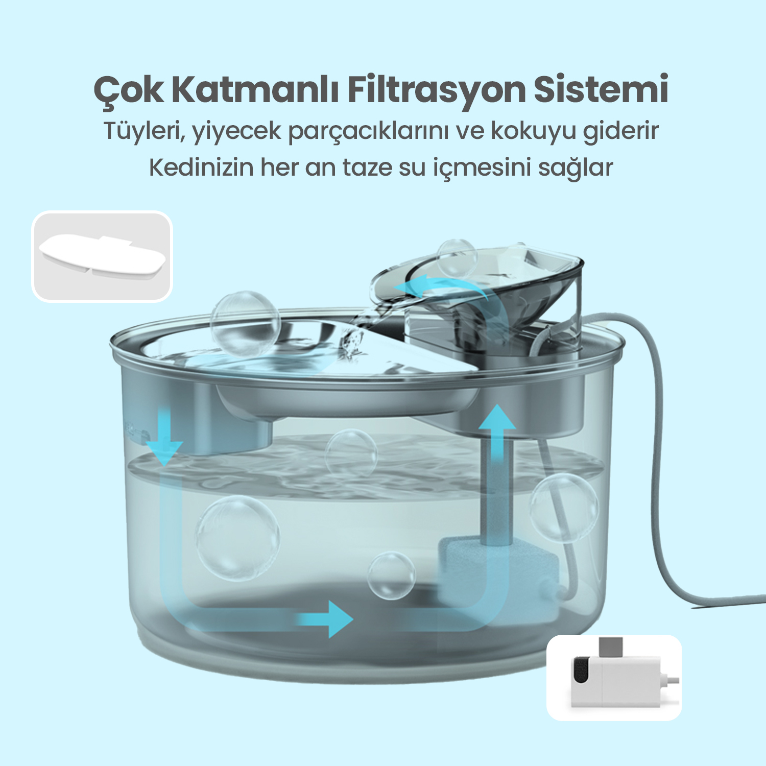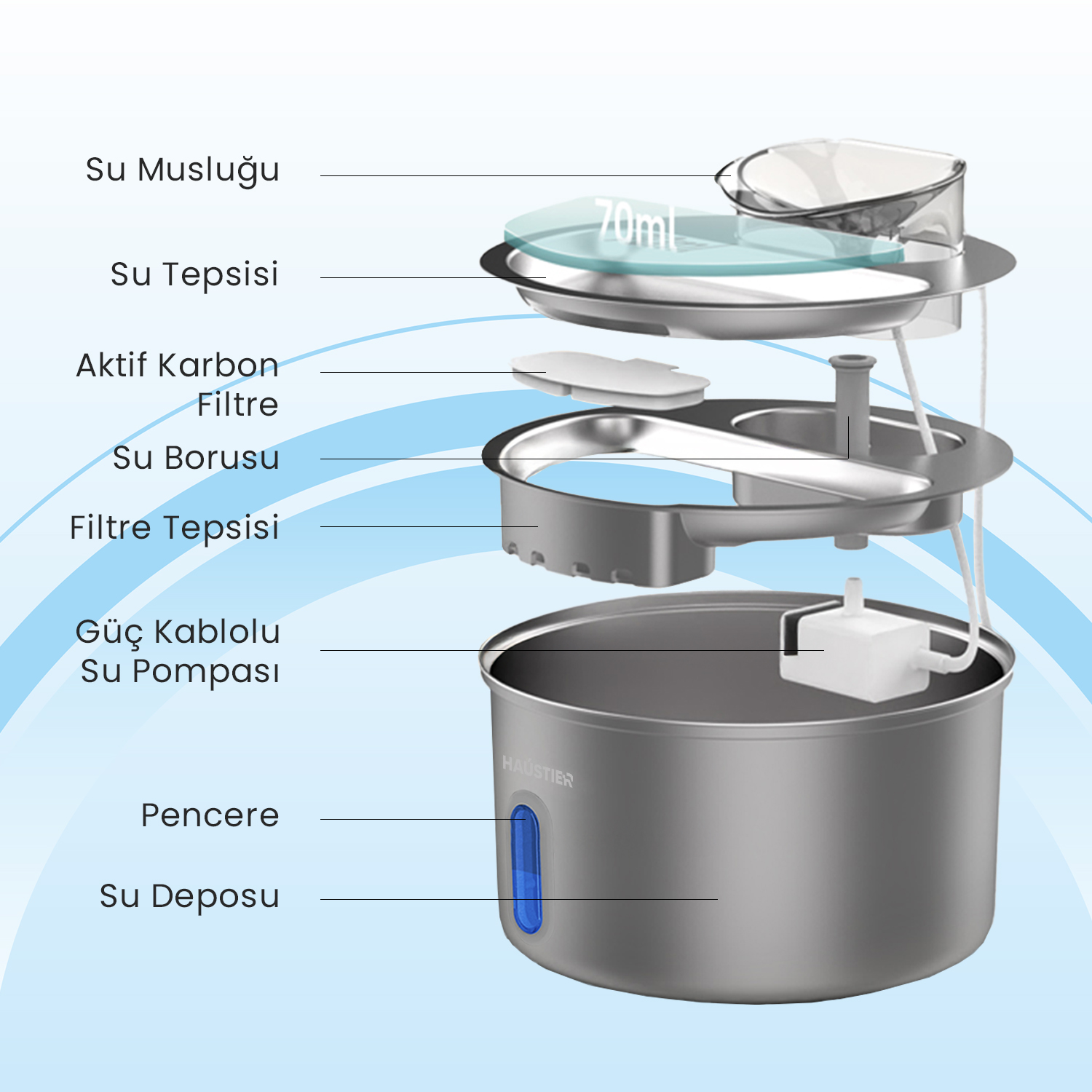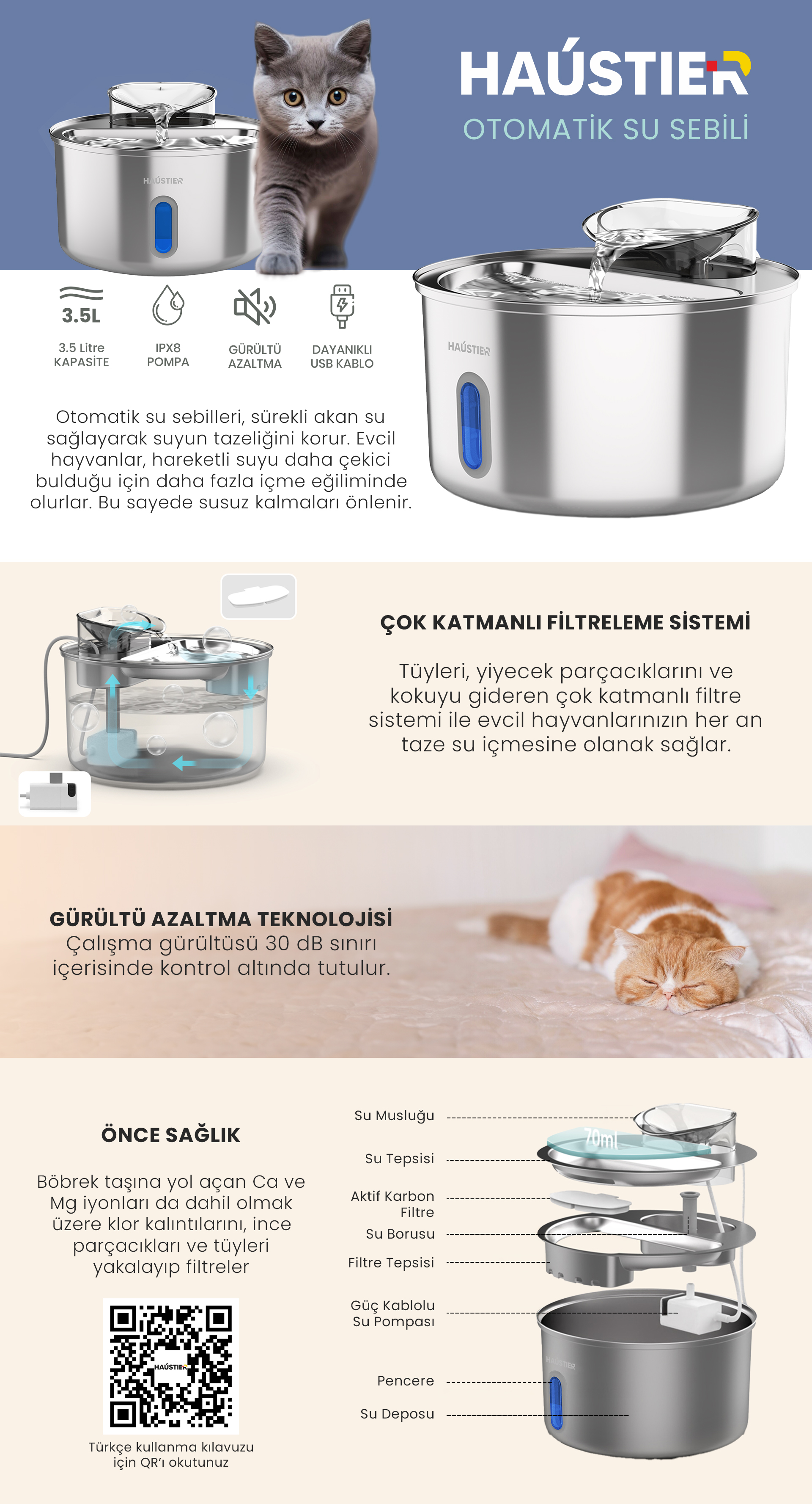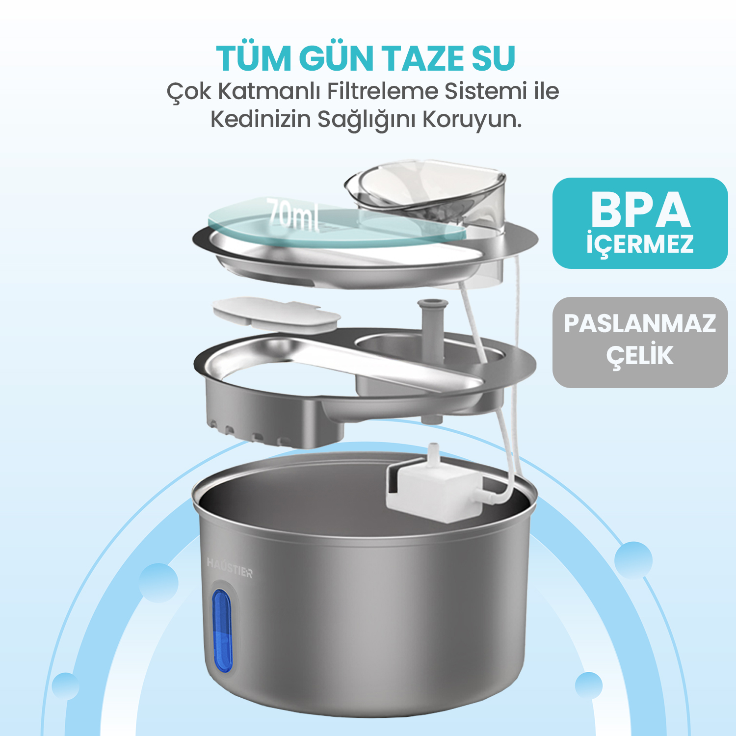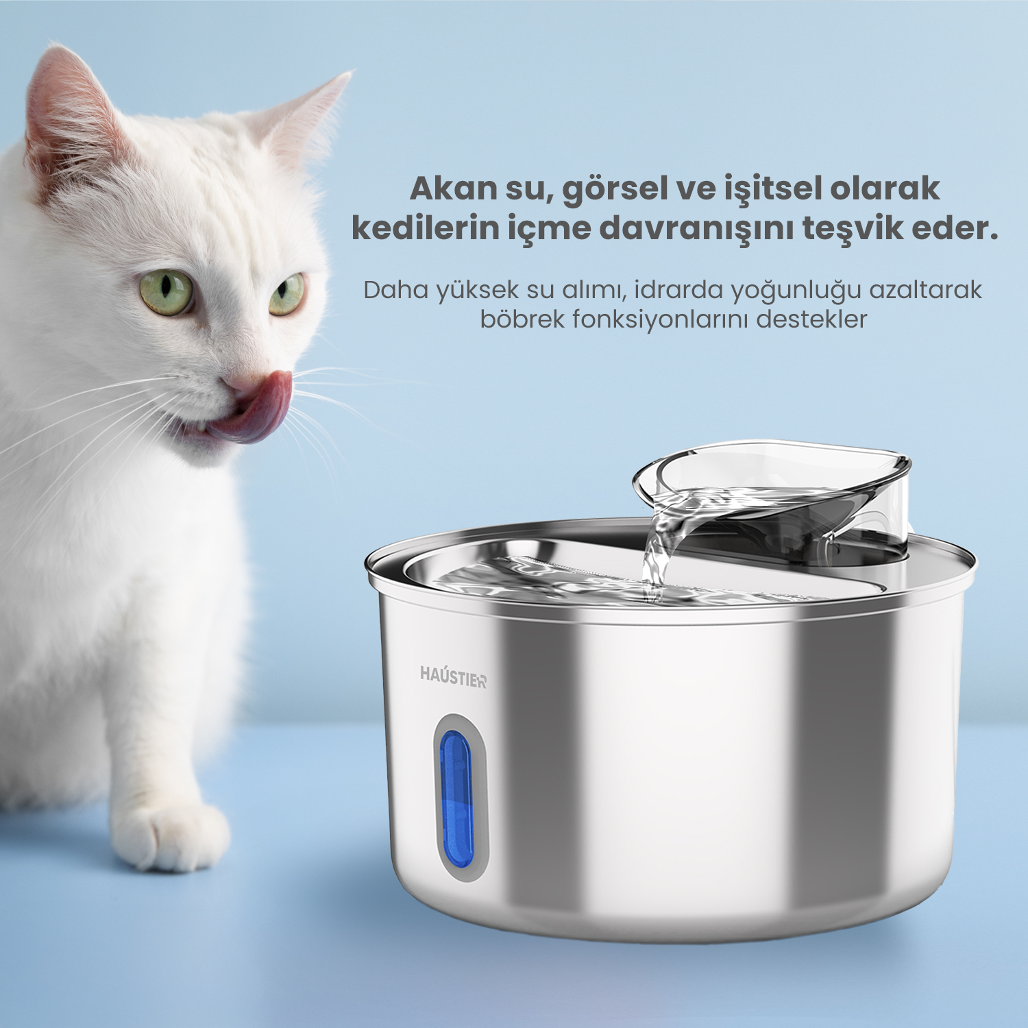 Haustier WF009L-W Metal Tasarım Pencereli Otomatik Kedi Su Sebili,Kedi Su Çeşmesi, Su Pınarı 3.5Lt Geniş Hazne, SUS304 Çelik, Ultra Sessiz, Çok Katmanlı Filtrasyon